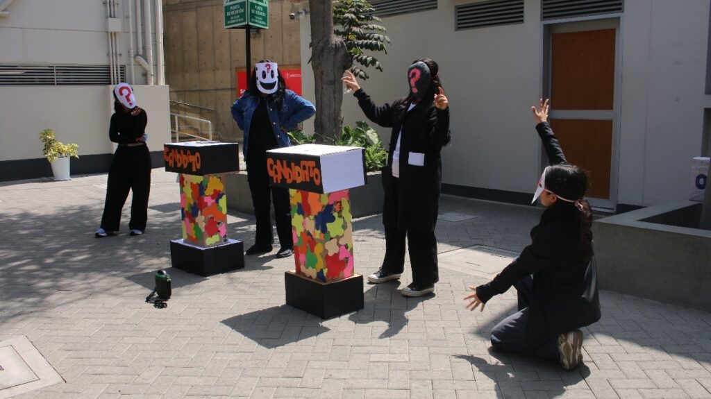 La intervención artística, desarrollada en el marco del curso «Educación y Arte» y bajo la dirección de la Mg. Magari Quiroz, propuso una reflexión crítica mediante la sátira política. La trama giró en torno a la representación de dos candidatos que, tras realizar promesas inviables y populistas, incumplen su palabra al llegar al poder, conduciendo al país hacia escenarios de caos social y violencia.