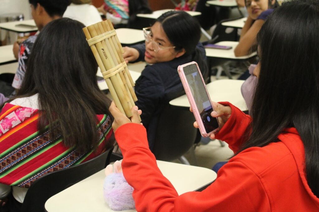 La jornada inició con un colorido pasacalle, donde los sikuris llenaron el campus de música y color mientras recorrían desde el pabellón central hasta el aula del conversatorio.